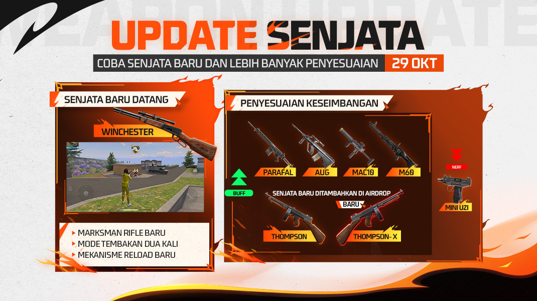 - Drop rate beberapa item dikurangi 50%: 2000 FF Coins, Helm Lv. 3, Vest Lv. 3, dan granat.
