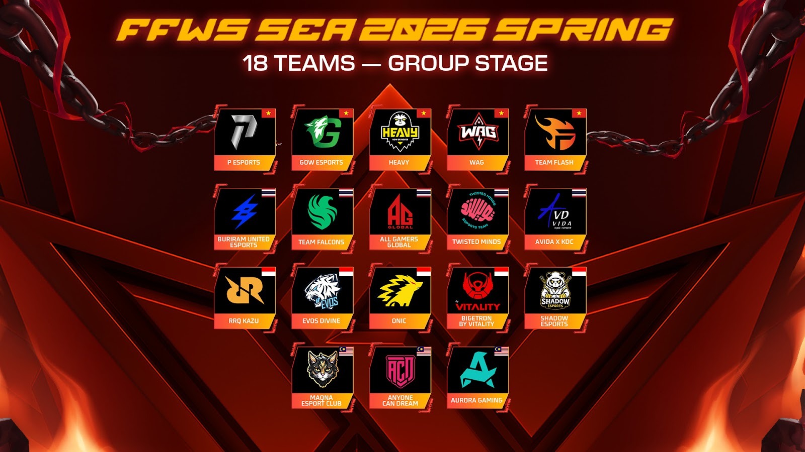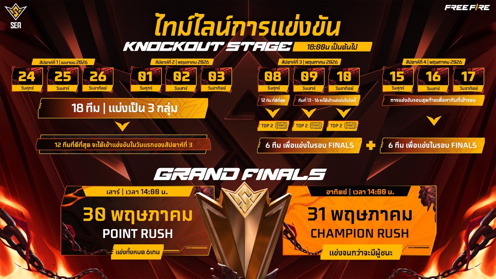 เตรียมตัวกันให้พร้อม กับการแข่งขันฟีฟายสุดยิ่งใหญ่รายการ Free Fire World Series SEA 2026 Spring กำลังจะเริ่มต้นขึ้น มาร่วมเป็นสักขีพยานการแข่งขันในรอบ Knockout Stage สัปดาห์แรกที่จะเริ่มขึ้นในวันศุกร์ที่ 24 เมษายนนี้ไปด้วยกัน กับสุดยอด 18 ทีมดังจากประเทศต่าง ๆ ในภูมิภาค SEA ได้แก่ เวียดนาม ไทย อินโด และมาเลเซีย