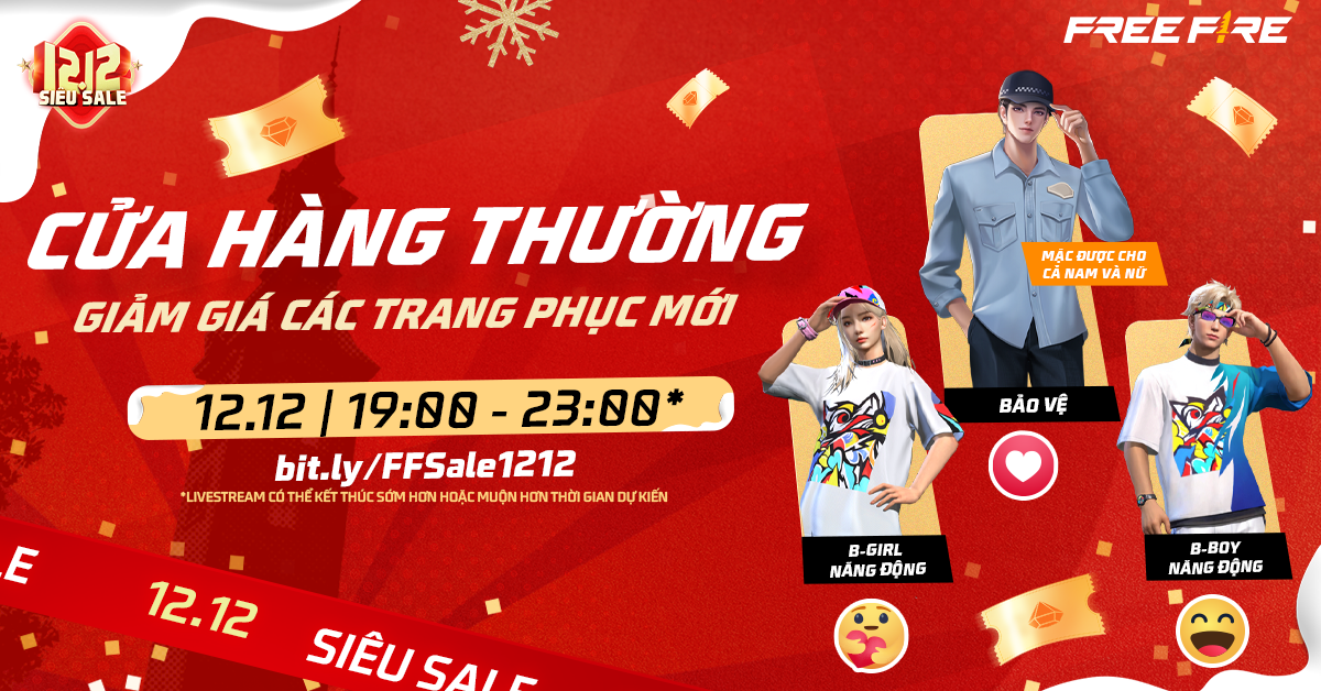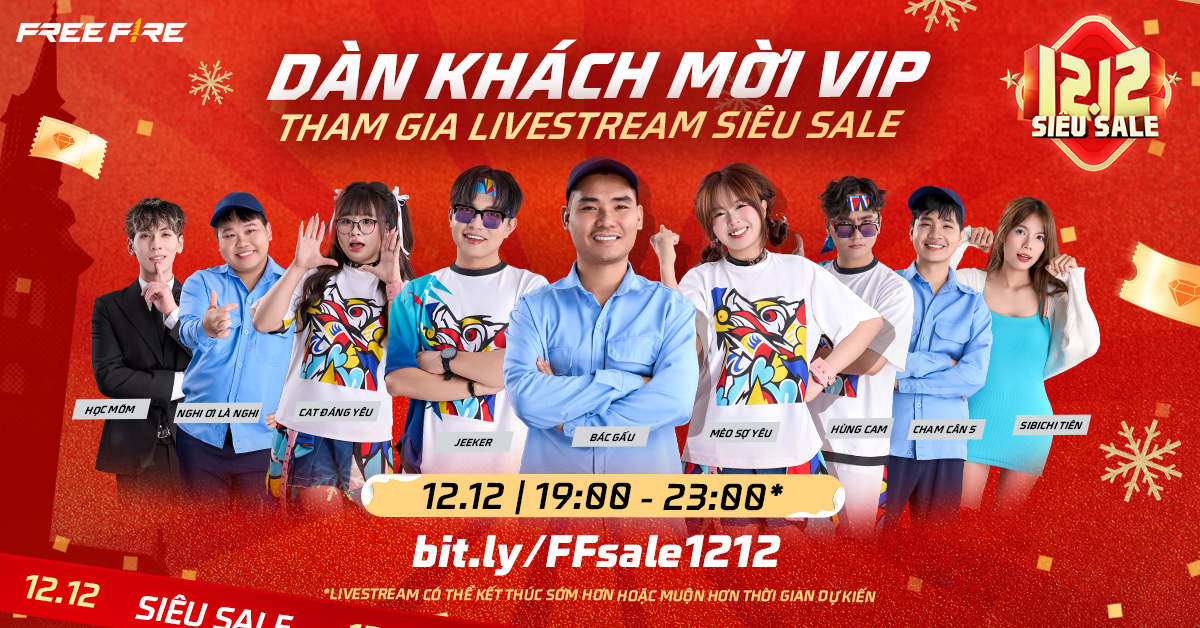 Theo dõi toàn bộ Livestream Siêu Sale từ 19:00 đến 23:00 ngày 12/12 tại trang web bit.ly/FFsale1212 và tại Tik Tok Garena Free Fire VN