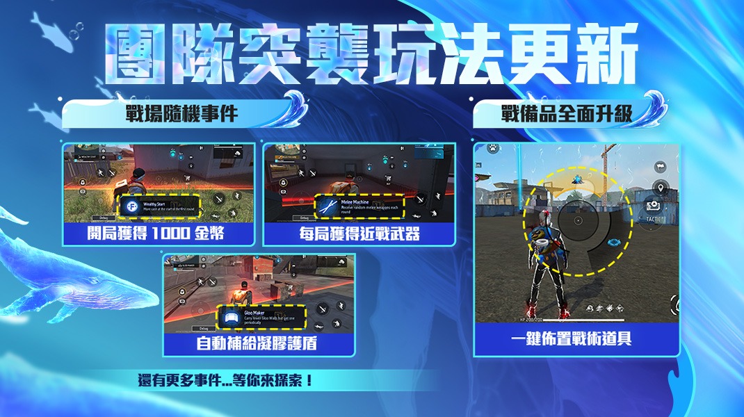 從激烈的經典模式戰鬥中稍作休息,去釣取物資和增益效果吧!與隊友合作奪取氣泡空投,獲得其中的強力道具。與朋友一起潛入海中,統治水的世界!