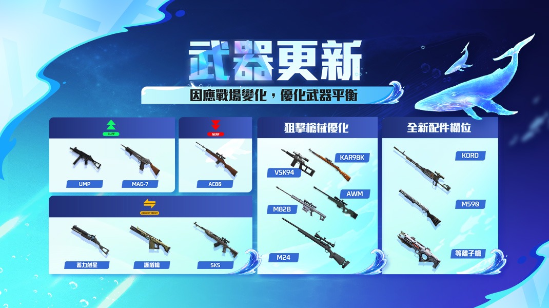 - 蓄力剋星(調整):彈丸數量 8 → 7,新增前握把欄位,移動速度 +6%,肢體傷害 +25%。